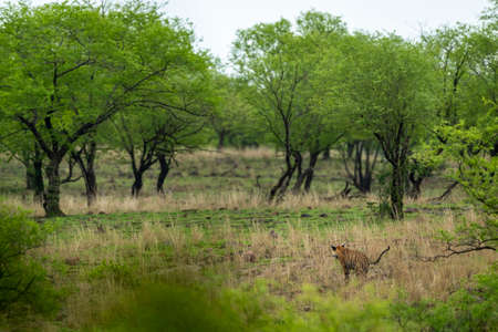 wild tiger on a rainy day in natural green forest during monsoon season safari at ranthambore national park or tiger reserve rajasthan india