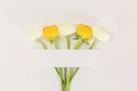 Colorful ranunculus flowers in a soft yellow envelope on a matching pastel yellow background, generative ai