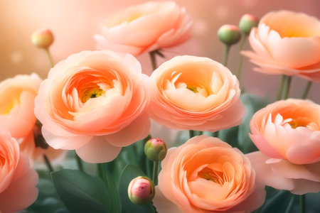 Spring blossom background with beautiful ranunculus with bokeh in velvety peach tones. Trending color concept of the year 2024 Peach Fuzz.