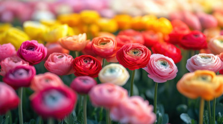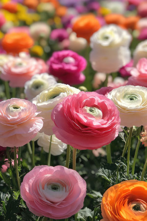 Vibrant field of ranunculus flowers is blooming in a variety of colors