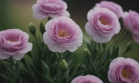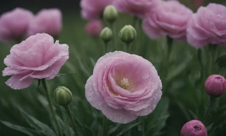 Beautiful pink ranunculus flowers with raindrops in the garden