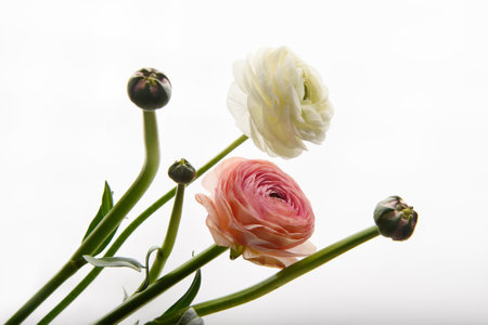 Two Ranunculus flowers on a white background. Horizontal photo. Style. Universal close-up photo. Picture in a frame.