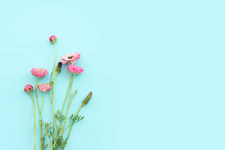 Spring ranunculus flowers bouquet on blue pastel background top view in flat lay style with copy space for text. Generative AI illustration