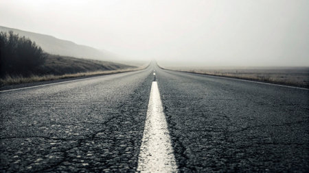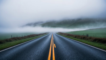 Asphalt country road is disappearing into thick fog rolling over green hills on an overcast day
