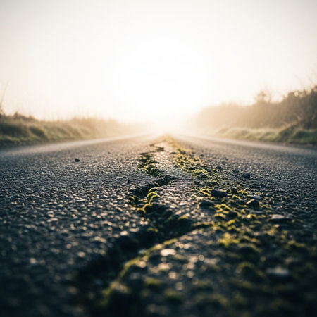 A tranquil coastal road stretches towards the horizon, bathed in soft sunrise light. Gentle waves lap the shores, creating a serene atmosphere perfect for travel inspiration.