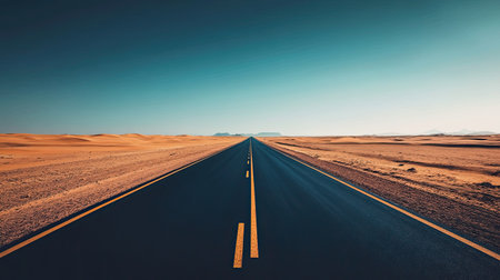 A striking desert road stretches towards the horizon, offering a sense of freedom and adventure. The clear blue sky contrasts beautifully with the golden sands.