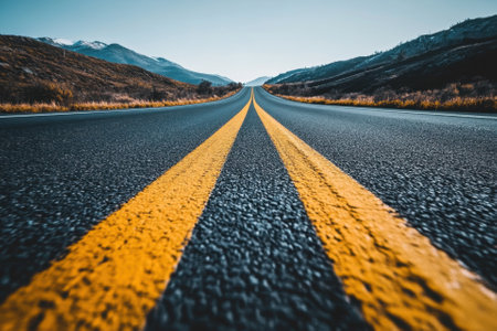 Vibrant Yellow Lines on a Serene Roadway Leading Towards Majestic Mountains Under a Clear Blue Sky