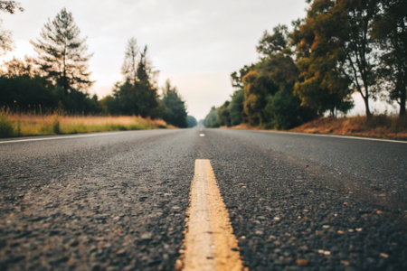 An asphalt road stretches into the distance, framed by trees under a colorful sunset. The scene displays warm colors and strong lighting. Suitable for travel, editorial, or commercial projects. The perspective is low angle with emphasis on the road markings.