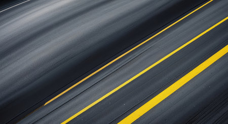 AI Generated. Curved asphalt road from a top view features smooth dark gray textures with yellow lines positioned diagonally for creative project backgrounds