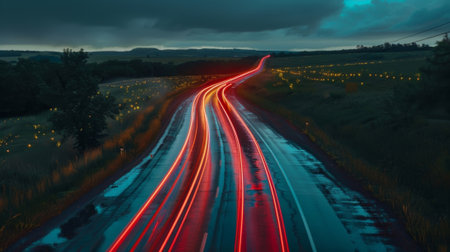 Long exposure photo of glowing car light trails illuminating a winding mountain road at dusk, creating a mesmerizing scene of movement and light