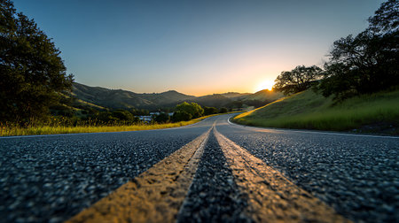 Captivating low-angle shot featuring a winding asphalt road stretching towards a distant sunset over rolling hills, with trees lining the horizon and golden hour lighting.