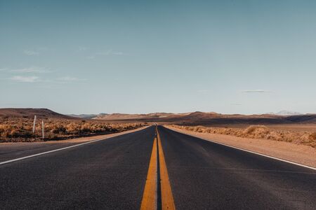 Natural american landscape with asphalt way to horizon. Panoramic picture of a scenic road, USA. Endless straight, Route 66.