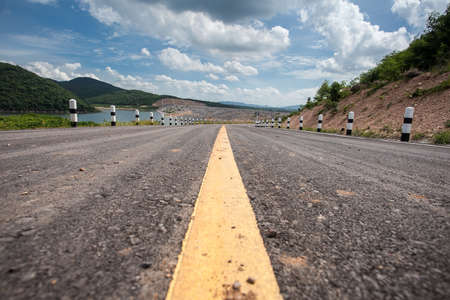 Empty asphalt road leading through mountains with yellow lines in the middle.