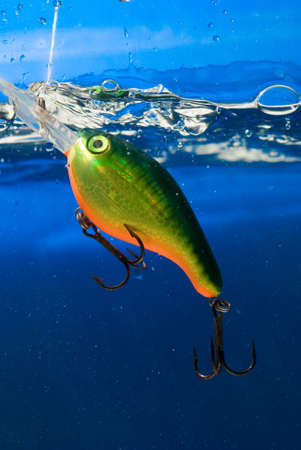 Old plastic spinning bait catching fishes in water. Splashes, water drops around. Calm water background. Fishing equipment. Favorite leisure activity for men at the weekend