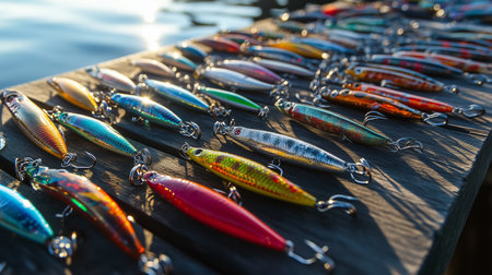 A set of premium fishing lures shimmering in the sunlight and designed to attract the biggest and most elusive fish