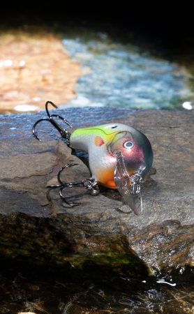 Vivid Fishing Lure on Riverside Rock with Fisherman Casting in Blurred River Scene