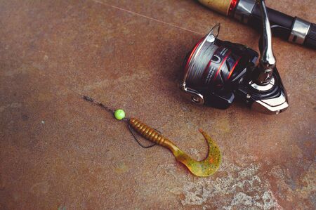 Spinning fishing rods, fishing hooks, silicone baits on a wooden