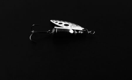 An exhibition of pirated copies of fishing metal spoon baits. Bait for fishing in the shape of a spoon with a hook on a black background.