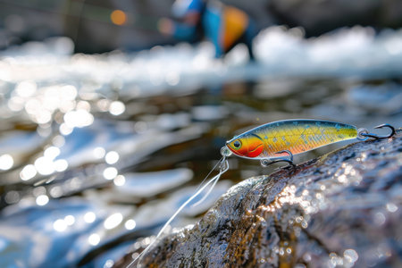 A vibrant fishing lure sits prominently on a riverside rock with a blurred view of a fisherman casting in the river's flowing waters. the dynamic play of light on the ripples enhances the thematic focus on fishing and outdoor adventure.