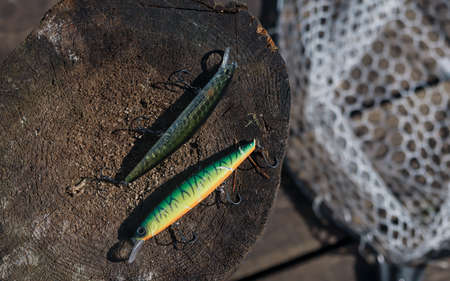 Colorful fishing baits with plummets on wooden table. Wobbler on a wooden board with beautiful eyes. Toned image and top view. Stock background, photo