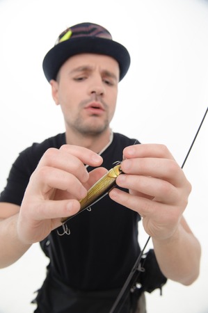 Selected focus on the bait in the form of yellow fish Handsome fisherman wearing black T-shirt on background
