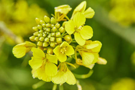 A cluster of wild mustard flowers bloom in a planter box in a Japanese park. These wild, edible plants are often harvested by the Japanese and are sometimes planted in parks and other green spaces for public harvest and consumption.