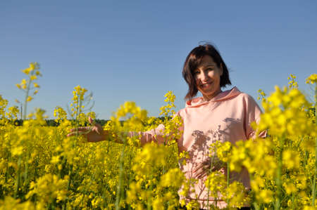 Beautiful young woman in the middle of a field of yellow rapeseed or canola flowers. Spring.