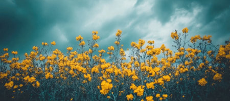 A picturesque field of yellow flowers contrasts against a cloudy sky, creating a serene natural landscape in the ecoregion. The vibrant flowers stand out against the grassland plains