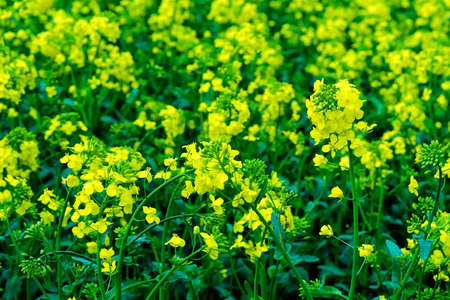 Fields of yellow flowering nanohana at Gongendo Park in Satte,Saitama,Japan