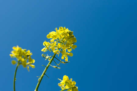 Yellow rapeseed flowers in a field against a blue sky. yellow rapeseed flowers, rape, colza, rapaseed, oilseed, canola, closeup against s sunny blue sky