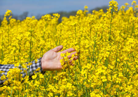 Farmer on the field touches the rape flowers. Harvest in summer.