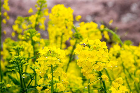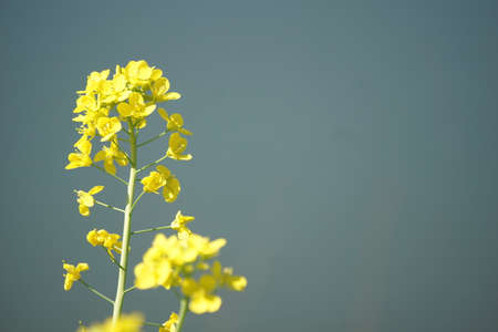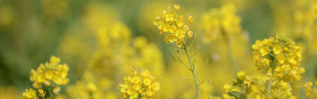 Beautiful yellow canola flowers of rapeseed crops in bloom in spring, selective focus