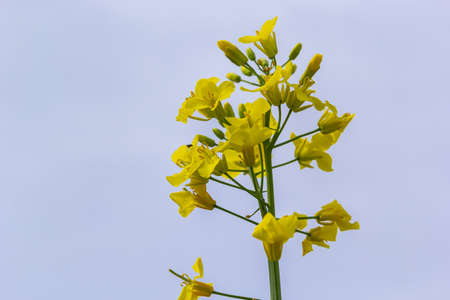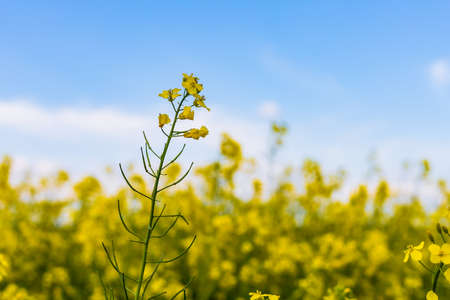 Detail of flowering rapeseed canola or colza field in rural british lands, plants for green energy and oil industry, rape seed flowering landscape with clear blue sky and blurry background