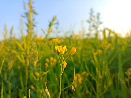 summer, nature, spring, freshness - background of fresh wild field beautiful natural flower plant on spring green evening meadow. yellow blooming rapeseed seeds on grey sky sunset garden summertime