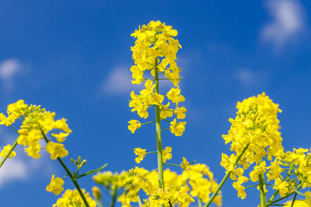 Rapeseed crops with blooming yellow flowers in spring on a sunny day, low angle view