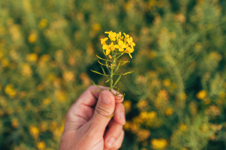 Farmer agronomist examining blooming canola crops in field, agriculture and farming concept, closeup of hand