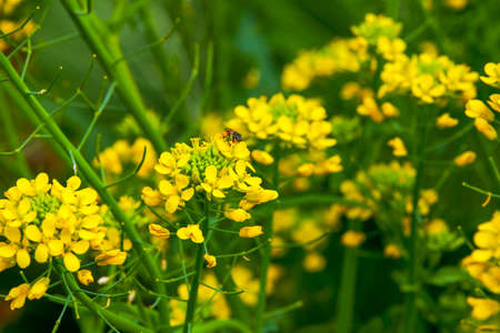 A small hoverfly feeds from A cluster of wild mustard flowers bloom in a planter box in a Japanese park. These wild, edible plants are often harvested by the Japanese and are sometimes planted in parks and other green spaces for public harvest and consumption.
