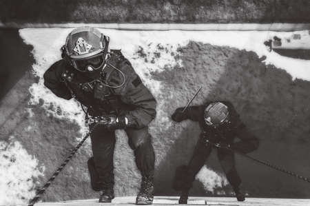 Two commandos train at the base. Climbers. SWAT, police, counterterrorism concept. Mixed media
