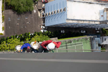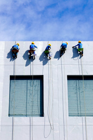Painters Hanging from a Rope, Painting the Building Exterior Wall.
