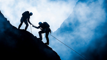 Silhouettes of two mountaineers assisting each other during a challenging climb, symbolizing teamwork and overcoming obstacles.