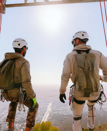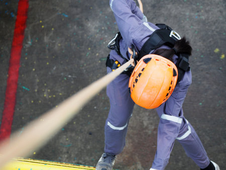 Construction engineer rappelling from a tall building with rope for site inspection and safety