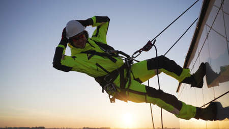 High rise window cleaner. Glass cleaner working. Most dangerous jobs in the building, cleaning and maintenance industries. Building cleaning workers. Cleaning windows service. High risk work.
