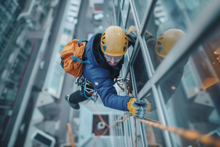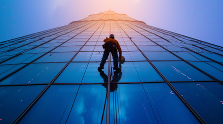 Industrial mountaineer worker washing outside façade glazing, hanging over building, Generative AI