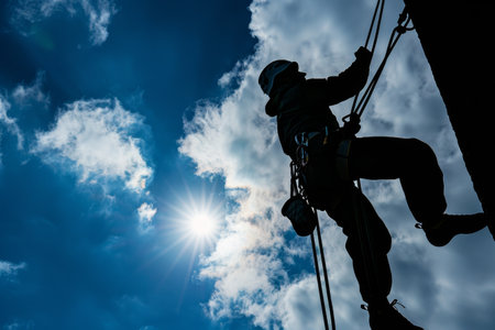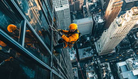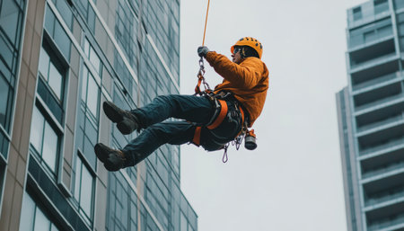 Construction engineer rappelling down a skyscraper a daring display of skill and precision