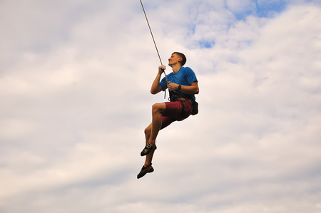 Rock climber swinging on rope and flexing muscles jokingly against blue sky
