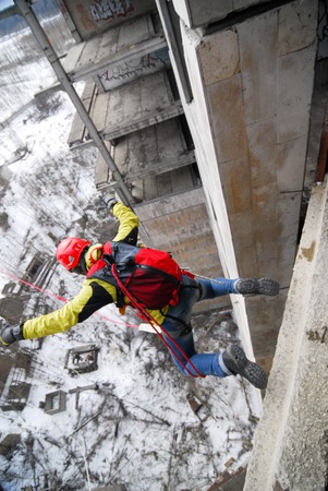 ZHELEZNODOROZHNIY, RUSSIA - March 9, 2008 - Rope jumping event held at the abandoned building construction site. Sports enthusiast groups organize such events for adrenaline lovers from all over Moscow district