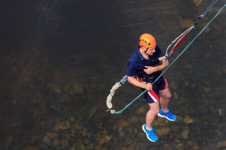 Rope jumping from high altitude of bridge. Bungee jumping from pedestrian bridge over beautiful river