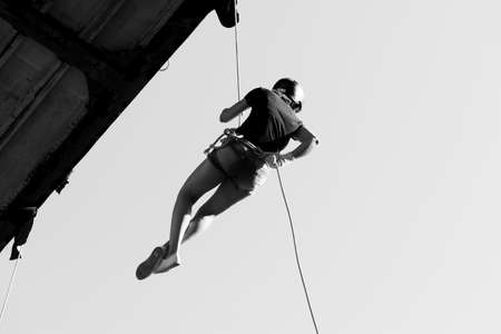 Salvador, Bahia, Brazil - September 17, 2019: Woman practicing rappel on a pedestrian walkway. Salvador Bahia Brazil.