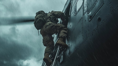 Rear view of a soldier climbing a ladder to a helicopter generative ai