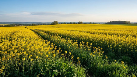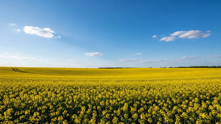 Expansive canola field in full bloom with bright yellow flowers under a clear blue sky. Concept of agriculture, vibrant landscapes, crop fields, and natural beauty.